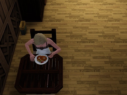 Agnes loses the game of horseshoes so she goes inside to make dinner. Little Alisha is having dinner too; a nice meal of toddler mush. Mmmm... >.>